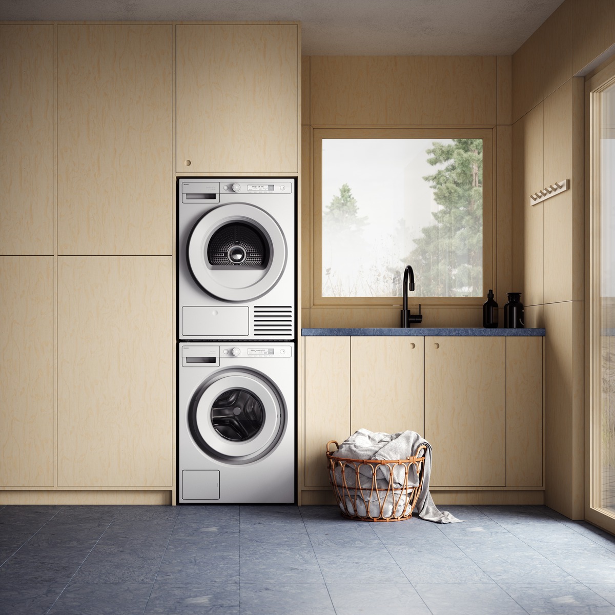 早いドラムの回転速度を誇りながらも、スチール製の強固な本体と、振動を吸収するショックアブソーバーで、洗濯/脱水時の騒音を極限まで抑えたアスコのドラム式洗濯機。 9.0kgの大容量ドラムで衣類に洗浄水を含ませながら優しく洗い上げるから、ファブリックケアも叶う。 北欧ならではのシンプルなデザインは、清々しいランドリースペースを演出する。